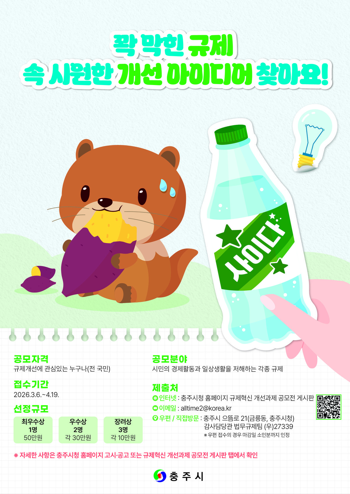 [충청뉴스큐] 충주시는 시민의 일상과 경제활동을 불편하게 만드는 각종 규제를 발굴 개선하기 위해 ‘2026년 규제혁신 개선과제 공모전’을 개최한다고 6일 밝혔다.