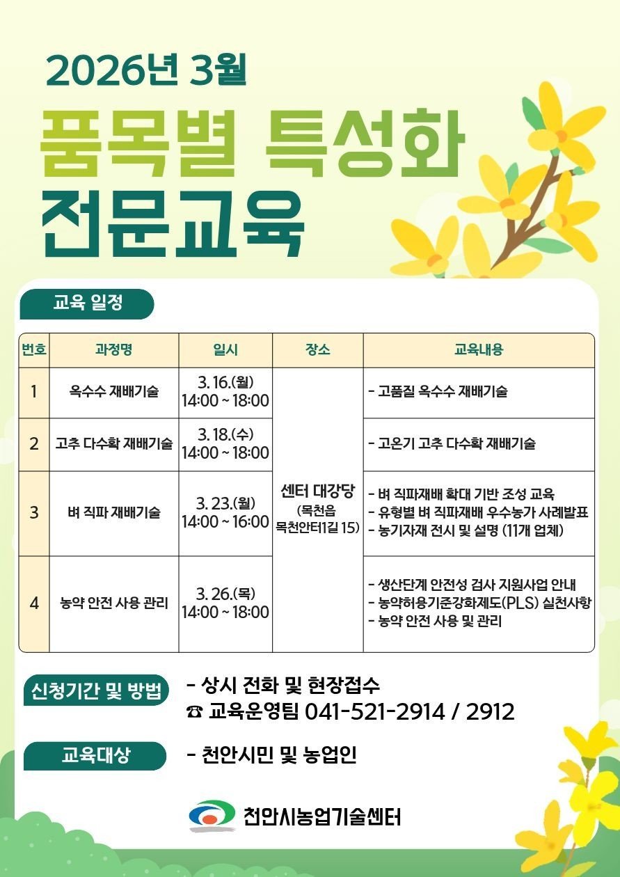 [충청뉴스큐] 천안시농업기술센터는 본격적인 영농철을 앞두고 ‘품목별 특성화 전문교육’을 운영한다고 6일 밝혔다.