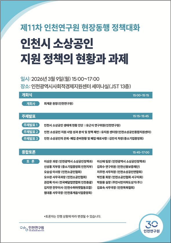 [충청뉴스큐] 인천연구원은 2026년 3월 9일 오후 3시 인천광역시사회적경제지원센터 세미나실에서 "인천시 소상공인 지원 정책의 현황과 과제"라는 주제로 ‘제11차 현장동행 정책대화’를 개최한다.