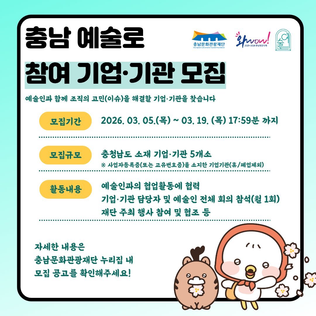[충청뉴스큐] 충남문화관광재단이 기업 기관의 당면 과제를 예술적 협업으로 풀어내는 '2026 충남 예술로 지역사업'참여처를 오는 3월 5일부터 19일까지 모집한다.
