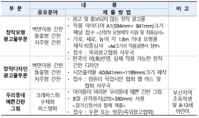 공모부문은 창작모형 광고물 부문, 우리동네 예쁜간판 그리기 2개 부문으로 다양하고 창의적인 작품을 모집한다.