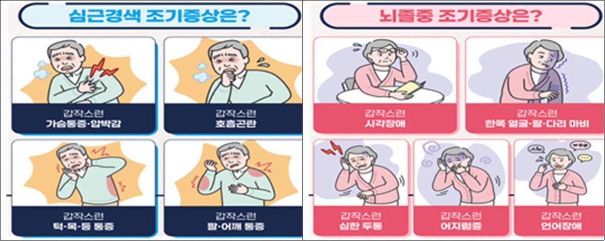 시는 심근경색 및 뇌졸중의 조기증상을 숙지하고 의심 증상이 발생할 경우 지체 없이 119에 신고해 신속하게 전문 치료를 받을 것을 당부했다.