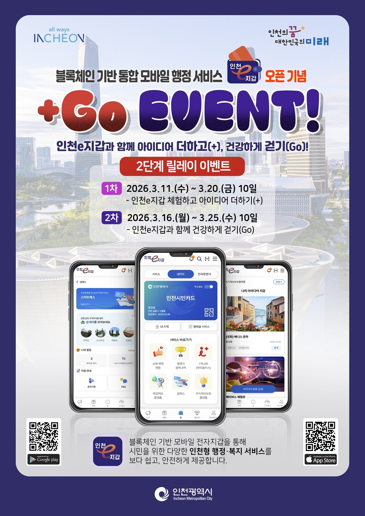 [충청뉴스큐] 인천광역시는 블록체인 기반 공공서비스 통합 앱 인천e지갑 서비스를 2월 26일 개시하고 시민 참여 확대와 서비스 이용 활성화를 위한 오픈 기념 이벤트 '아이디어 제안 및 걷기 챌린지'를 3월 11일부터 25일까지 2단계 릴레이 방식으로 진행한다고 밝혔다.