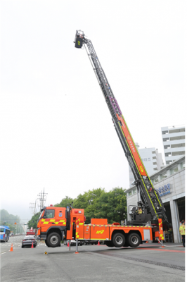 이번에 수성소방서에 배치되는 고가사다리차는 바스켓형 직진식 사다리차로써 최대 53미터까지 전개되어 17층 높이의 건물에 인명구조 및 화재진압이 가능하다.