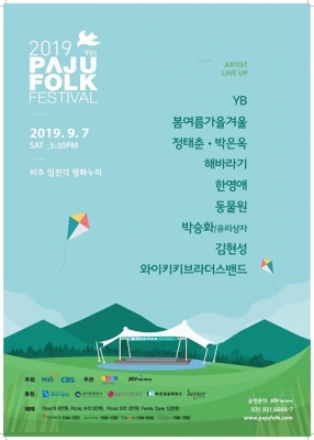 올해 9회째를 맞아 파주시 CBS 주최, 경기문화재단, 죠이커뮤니케이션 주관으로 열리는 파주포크페스티벌은 YB, 봄여름가을겨울, 정태춘 박은옥, 해바라기, 한영애, 동물원, 박승화, 김현성, 와이키키브라더스 밴드 등 9팀 출연이 확정됐다.