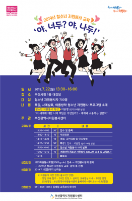 [충청뉴스큐] 부산시는 22일 시청 1층 대강당에서 여름방학을 맞이한 청소년 자원봉사자 700명을 대상으로 ‘2019년 청소년 자원봉사 교육…‘야, 너두? 야, 나두’’를 시행한다고 밝혔다.