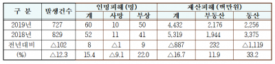 화재발생 건수는 전년 상반기 대비 102건이 감소하였으며, 재산피해도 887백만원이 감소했다. 인명피해는 60명의 사상자가 발생해 사망 1명 감소, 부상 9명이 증가한 것으로 나타났다.