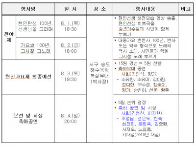 특히, 올해는 현인선생 탄생 100주년이 되는 뜻깊은 해로서 현인 선생을 위한 특별한 시간을 마련했다. 전야제인 8월 1일부터 2일까지 현인 선생의 생전모습을 영상으로 송출하고 선생의 히트곡을 중견가수들과 시민들이 함께 부르면서 가수들과 관람객들의 가슴에 또 하나의 추억을 새길 것이다.