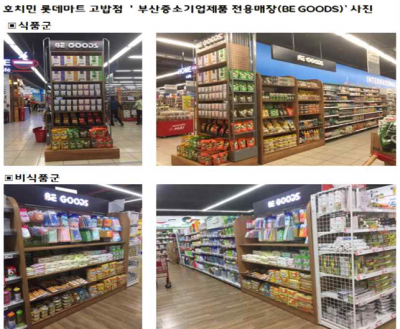또한 부산시는 창조경제혁신센터와 함께 베트남 현지에 ‘부산 중소기업제품 전용매장’을 운영하고 있다. 베트남 호치민 롯데마트 고밥점에 지난해 6월 문을 연 이래 지역 가공·냉동식품 5개사, 주방·생활용품 6개사, 화장품 1개사 등 총 12개사가 입점, 매달 600만 원 이상의 매출을 올리고 있다. 올해는 매장 입점기업 수를 2배로 늘려 지역 소비재기업의 베트남 진출을 선도한다는 계획이다. 또한 매월 시음·시식·체험행사 등 프로모션을 개최하여 부산기업의 우수제품에 대한 홍보에도 집중하고 있다.