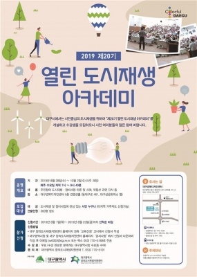이번 20기는 28일부터 10월 2일 까지 매주 수요일 대구경북디자인센터에서 오후 7시부터 9시까지 진행된다. 신청기간은 이달 23일까지 선착순 마감된다. 대구시 및 창의 도시재생 지원센터 홈페이지 공지사항을 참조하거나, 대구시 도시재생과, 창의 도시재생 지원센터로 문의 및 접수 가능하다.