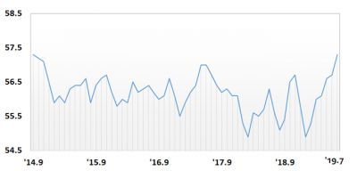 부산의 2019년 7월 고용률은 57.3%로 지난해 같은 달 대비 1.7%포인트 상승해 7대 특·광역시 중 최고 상승률을 보이며 2014년 9월 이래 최고치를 나타냈다. 특히, 64세 이하 고용률은 64.8%로 지난해 같은 달 대비 2.1%포인트 상승해 탈꼴찌를 기록하며 7대 특·광역시 중 4위를 했다. 이는 지난달에 이은 계속된 고용지표 최고치 갱신으로 고용 회복 흐름이 지속되고 있음을 보여준다.