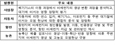 미세먼지 주요 발생원은 사업장·자동차·항만·농촌 지역을 대상으로 하고, 미세먼지 생성·이동·확산 및 주변 대기에 미치는 영향 분석 등 다양한 발생원별 미세먼지 원인을 심층·종합적으로 규명한다.