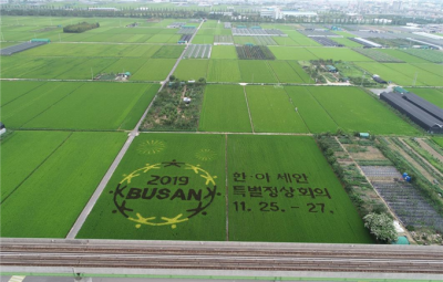 부산시 농업기술센터는 지난 6월, 강서구 대저1동 일원 가로 98m, 세로 89m 크기의 논에 한·아세안 특별정상회의 엠블럼과 개최일자를 조합해 색깔 있는 벼를 심었다.