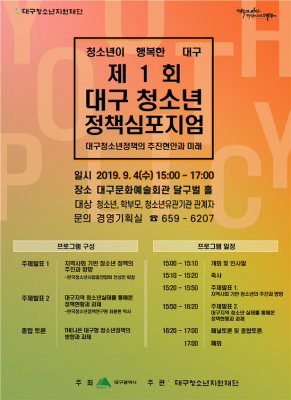 [충청뉴스큐] 대구시와 대구청소년지원재단은 오는 4일 오후 3시 대구문화예술회관 달구벌홀에서 지역 청소년 현장 전문가들과 지역 및 중앙 청소년 정책 전문가들, 청소년 당사자 등 200여 명과 함께 ‘제1회 대구청소년 정책심포지엄’을 개최한다.