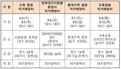 오는 4일과 5일 이틀 동안 중구 동인동 시청본관 주차장에서, 9.6에는 정부대구합동청사 내 2층 로비에서 개최되며, 7일과 8일 이틀은 동대구역 앞 광장 그리고 9.9~9.10은 두류공원 인라인스케이트장에서 오전 10시부터 오후 6시까지 열린다.
