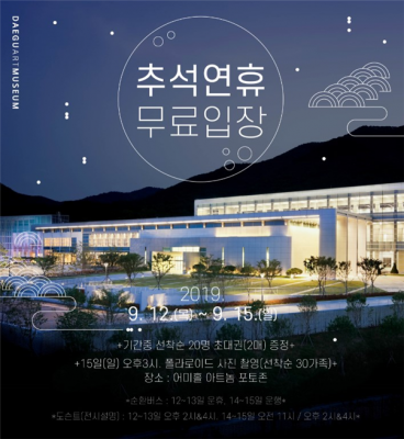 [충청뉴스큐] 대구미술관은 민족 최대의 명절 추석을 맞아 오는 12일부터 15일까지 휴일 없이 개관한다. 기간 중 선착순 20명에게 초대권 증정 및 가족 즉석 사진 이벤트를 실시해 관람객들에게 따뜻한 한가위를 선사한다.
