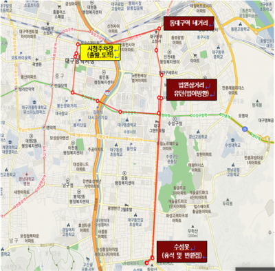 자전거 대행진은 총 15km를 주행하며 시청본관 주차장을 출발해 교동네거리~신천교~동대구역네거리~두산오거리~수성못~법원 삼거리~범어네거리~봉산육거리~시청본관 주차장으로 돌아오는 코스다.