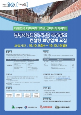 관광사업체 역량강화 컨설팅 지원사업 설명회 및 접수는 14일 오후 1시 대구시 중구 소재 대구청년센터 2층 상상홀에서 진행되며, 설명회가 끝난 후 현장 신청서접수 데스크를 통해 바로 신청하면 된다.
