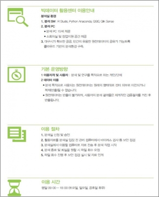 또한, 전문 인력이 상시 배치돼 빅데이터에 관한 모든 컨설팅 지원도 가능하며, 빅데이터 전문교육, 전문가 초청 특강 등 빅데이터에 관한 다양한 프로그램도 운영된다.