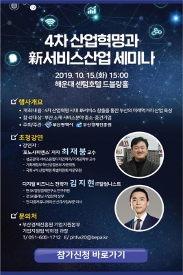 [충청뉴스큐] 부산시는 4차 산업혁명 시대를 맞아 서비스산업의 발전을 위하여 오는 15일 오후 3시 해운대 센텀호텔 4층 드블랑홀에서 ‘4차 산업혁명과 신서비스산업 세미나’를 개최한다고 밝혔다.
