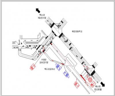 현재 요트경기장 내부의 교통체계는 정문 출입구를 통해 양방향 진출입 통행이 이루어지고 있으나, 앞으로는 기존 출입구는 진입만 허용하고, 해강초등학교 앞 출구로만 진출을 허용할 계획이다.