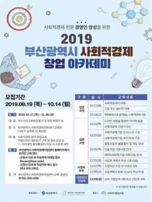 [충청뉴스큐] 부산시는 오는 17일부터 11월 8일까지 매주 목·금요일 총 8일 동안 부산시 사회적경제지원센터에서 사회적경제기업 창업에 관심이 있는 시민을 대상으로 ‘2019 부산광역시 사회적경제 창업 아카데미’를 개최한다고 밝혔다.