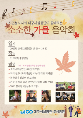 대구시설공단 도심공원은 오는 25일 오후 5시 30분, 2·28기념중앙공원에서 가을을 맞이해 대구시민의 재능기부와 봉사로 이루어지는 음악회를 연다.