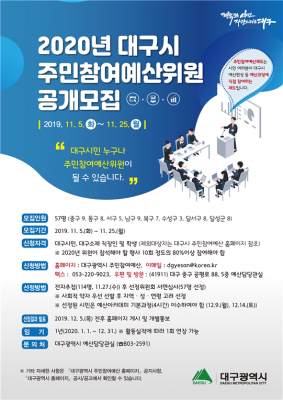 [충청뉴스큐]대구시는 주민참여예산제 운영에 적극적으로 활동해 줄 제5기 주민참여예산위원을 공개모집한다.