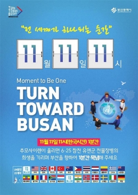 부산시는 부산 유엔기념공원을 향한 전 세계의 동시 묵념 및 추모 행사인 ‘턴투워드 부산’ 국제추모식을 국가보훈처와 함께 11월 11일 오전 11시 UN기념공원에서 개최한다고 밝혔다.