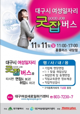 ‘굿잡버스’는 전문취업상담사와 구인기업체가 여성유동인구가 많은 대구시 구석구석을 찾아가 일자리를 희망하는 여성들에게 1:1 맞춤 취업상담, 여성취업 유망직종 안내, 현장면접 등 다양한 여성취업 지원서비스를 무료로 제공하는 행사다.