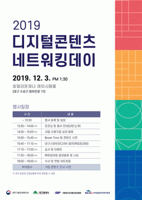 [충청뉴스큐] 과학기술정보통신부와 대구시가 지원하고 대구디지털산업진흥원이 주관하는 ‘2019 디지털콘텐츠 네트워킹 데이’가 열린다.
