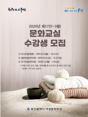 [충청뉴스큐] 부산시 여성문화회관은 시민들의 다양하고 전문적인 능력을 개발하고 삶의 질 향상을 돕기 위해 2020년 제1기 문화교실 수강생을 모집한다고 밝혔다.
