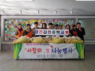 대전갑천중에서는 지난 5년간 꾸준히 사랑의 쌀 나누기 행사에 참여하고 있으며 2019년에는 총 235명의 학생이 자발적으로 참여해 약 210kg의 쌀을 모아 복지만두레에 기증했다.