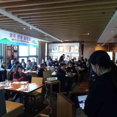 이날 설명회는 광주의 관광도시 브랜드 이미지를 개선하고 전문여행사 네트워크를 확대하기 위한 자리로 ㈜모두투어네트워크, ㈜롯데관광개발, 성광항공여행사, 굿필투어, 제인DMC코리아 등 30여 개 인바운드 전문 여행업체 대표와 광주시, 광주관광컨벤션뷰로 관계자 등 60여명이 참여했다.