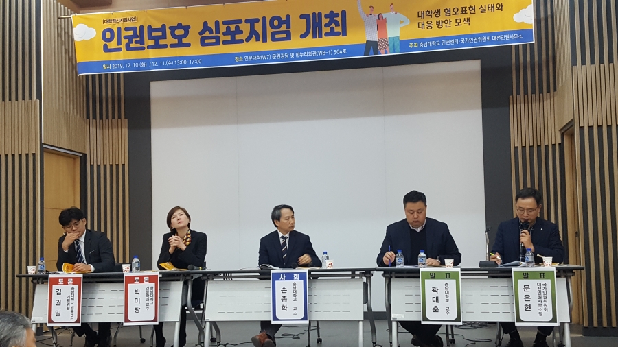 국가인권위원회 대전인권사무소(소장 문은현)는 10일. 충남대학교 인권센터와 대학내 혐오 현상을 진단하고 대응방안을 모색하는 “대학생 혐오표현 실태와 대응방안 모색을 위한 심포지움”을 개최하였다. 혐오표현 문제는 최근 우리사회에서 주목받은 이슈 중 하나로 혐오표현은 인간의 존엄과 가치에 대한 부정뿐만 아니라 차별을 조장하고 사회통합을 저해하는 문제를 안고 있다. 특히 여성, 장애인, 이주민‧난민, 성소수자 등에 대한 혐오표현이 확산되면서 이에 대한 우려와 대책마련을 요구하는 목소리가 높아지고 있지만 혐오표현을 제어하는 장치나 사회 각 영역에서의 자율적 노력은 여전히 미흡하다. 이에 국가인권위원회 대전인권사무소와 충남대학교는 이번 심포지움에서 대전지역 대학생들의 혐오표현에 대한 실태조사 결과를 바탕으로 혐오표현의 문제를 집중 논의한다. 대학 내에서 혐오표현에 기반하고 있는 특정집단에 대한 부정적인 편견을 교정하고 혐오표현 문제에 대한 인식을 높이기 위해서는 대학 내 교육현장에서의 실천 노력이 중요하기 때문이다. 국가인권위원회 대전인권사무소 문은현 소장은 “대학교내의 혐오를 예방하기 위해서는 근본적인 인식의 변환이 필요하다 생각하고, 이번 심포지움을 통해 대학생들과 시민들이 혐오표현의 개념과 문제점, 대응방향에 대해 구체적인 대책을 마련하는 계기가 되기를 기대한다.”고 밝혔다.