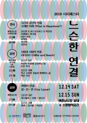 ‘지역거점별 소통협력공간조성 사업’의 일환으로 개최되는 ‘2019 시티페스타 : 느슨한 연결’은 시간과 공간, 사람, 취향의 연결을 통해 도시의 진정한 행복을 꿈꾸는 삶이라는 주제 아래 지속가능한 삶과 진정한 행복의 의미를 생각해보는 행사다.