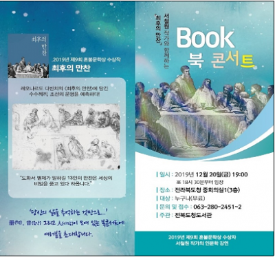 [충청뉴스큐] 전북도청도서관은 오는 20일 금요일 오후 7시 전라북도청 중회의실1에서‘‘최후의 만찬’ 서철원 작가와 함께하는 북콘서트’를 개최한다.