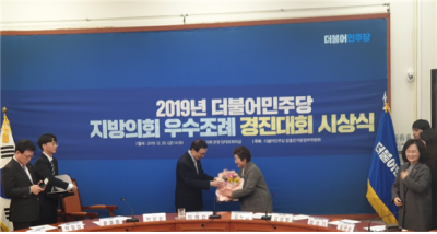 [충청뉴스큐] 경기도의회 도시환경위원회 심규순 의원은 지난 20일 ‘2019년 더불어민주당 지방의회 우수조례 경진대회’에서 ‘광역부문’ 최우수상을 수상했다.