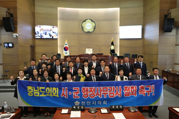 천안시의회(의장 인치견)는 지난10일 제216회 제1차 정례회 제1차 본회의에서 충남도의회의 시·군 행정사무감사 철회를 촉구 하는 결의문을 만장일치로 채택했다.