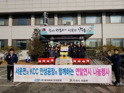 [충청뉴스큐] 안성시 서운면에 위치한 KCC안성공장은 27일 서운면 저소득가정과 지역주민을 위해 백미 100포, 라면 100상자를 서운면에 기탁했다.