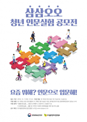 [충청뉴스큐] 문화체육관광부는 한국출판문화산업진흥원과 함께 생활 속에서의 다양한 인문활동을 발굴하고 장려하기 위해 11일부터 오는 31일까지 ‘삼삼오오 청년 인문실험 공모전’을 진행한다.