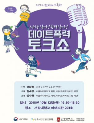 [충청뉴스큐] 여성가족부와 산하 한국여성인권진흥원은 오는 12일 오후 4시 30분 서강대학교 마태오관에서 데이트폭력 예방과 인식개선을 목적으로 대학생과 전문가가 참여하여 ‘친밀한 관계의 통제폭력 : 데이트폭력’을 주제로 이야기공연을 개최한다.