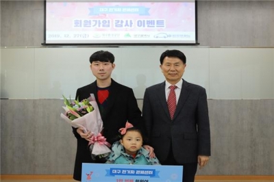 대구환경공단은 전기차 충전소 관제센터 1만번째 가입회원을 초청해 경품 휴대용 전기차 충전기를 전달했다.