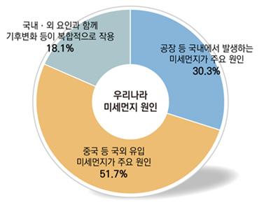 미세먼지의 발생 원인으로는 중국 등 국외유입으로 인식하는 비중이 가장 높았으며, 국내 발생 30.3%, 국내외·기후변화 등 복합적인 원인 18.1% 순으로 답했다.