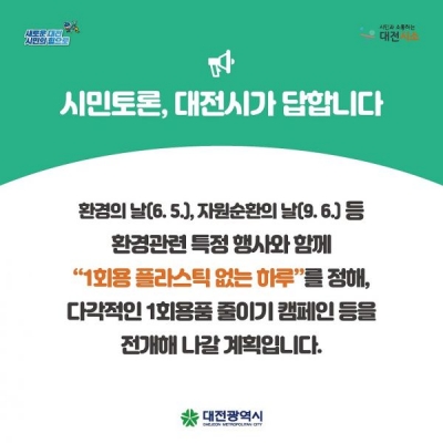 대전시 이만유 자원순환과장은 온라인 토론결과에 “환경의 날, 자원순환의 날 등 환경관련 특정 행사와 함께 ‘1회용 플라스틱 없는 하루’를 정해, 다각적인 1회용품 줄이기 캠페인 등을 전개해 나갈 계획”이라고 답변을 달았다.