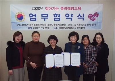 지난 15일에는 여성긴급전화1366 전북센터와 대한노인회전라북도연합회 경로당광역지원센터는 업무협약을 체결해 65세 이상 인구가 20%를 넘는 초고령 사회로 진입한 전북의 인구 구성에 맞추어 어르신 대상 폭력예방교육을 보다 적극적으로 실시할 수 있게 됐다.