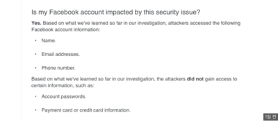 이에 앞서 페이스북은 13일 한국인의 개인정보 유출 규모에 대한 언급 없이 기본정보, 추가정보 등이 유출됐다는 사실을 방통위에 신고했다.