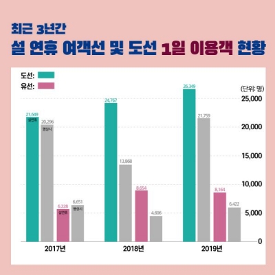 22일 해양경찰청에 따르면 최근 3년 간 설 연휴 기간 중 유·도선 이용객은 평상시 대비 각각 31%, 32% 증가했다.