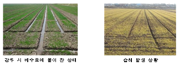 배수가 불량한 곳은 양쪽 배수로를 열어주고 배토기 등을 이용해 배수구를 다시 정비해 습해를 예방한다.