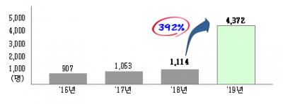 2019년에는 2018년 대비 392% 증가한 총 4372명을 채용했는데, 이는 역대 최대규모이다.